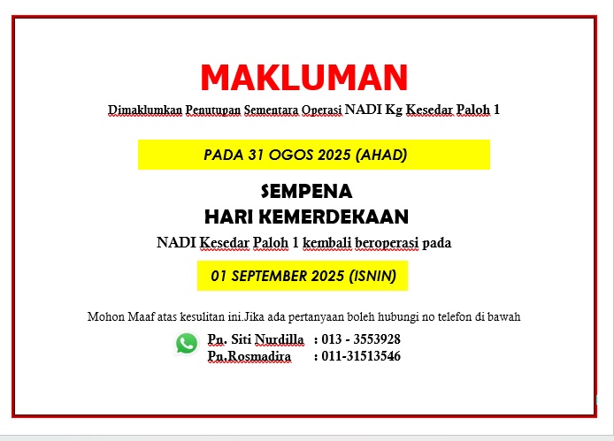 Notis Penutupan Sementara Operasi NADI Kampung Kesedar Paloh 1- Hari Kemerdekaan